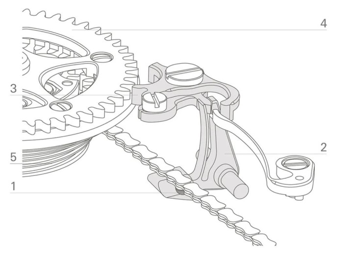 如果说芝麻链是对动力的源头进行干预,那朗格新型的恒定动力擒纵系统就相当于在发条盒和走时系统之间,增加了一个擒纵系统,这个系统会根据设置,预先拉紧擒纵机构游丝到一个点,等待发条盒动力传输最后一点点力,推动这个恒定动力擒纵系统完成关键运作,驱动走时轮系完成时间指示,它就像压倒大象的最后一根稻草。在这样的情况下,发条盒动力的变化就会被降到一个可以完全忽视的程度。